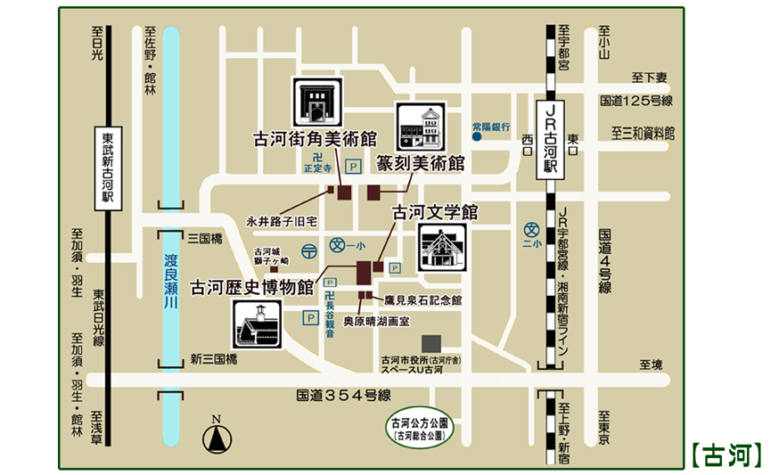 古河歴史博物館、鷹見泉石記念館、奥原晴湖画室、篆刻美術館、古河街角美術館、