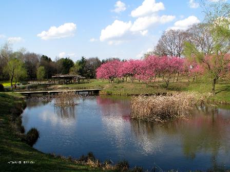 板張り床の管理棟/ガラス張りの喫茶店/1500本の花桃/雑木林/アスレチック遊具/富士見塚(小高い丘)/沼・橋/野外ステージ/大賀ハス/花菖蒲/藤棚/すすき/コスモス/茶畑/くじゃく