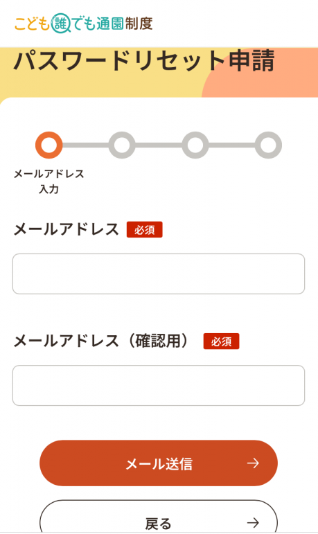 先ほどのURLを選択すると「パスワードリセット申請」の画面に入ります。左画像の画面から登録したメールアドレスを入力し、「メール送信」を行うと「パスワードリセットのご案内」が届きます。