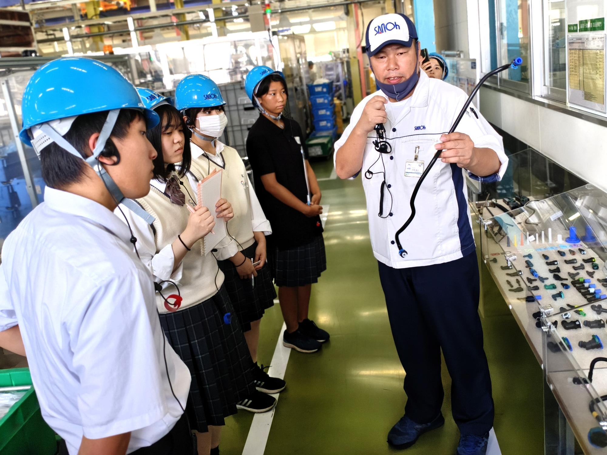 会社概要の説明を受けた後、工場見学をさせていただきました。AIを搭載したロボットや最先端の技術、多くの外国人社員が活躍している様子や、品質管理のための社内ルールの徹底について学び、世界を舞台に事業展開する企業を支える細やかな工夫や技術を感じることができました。