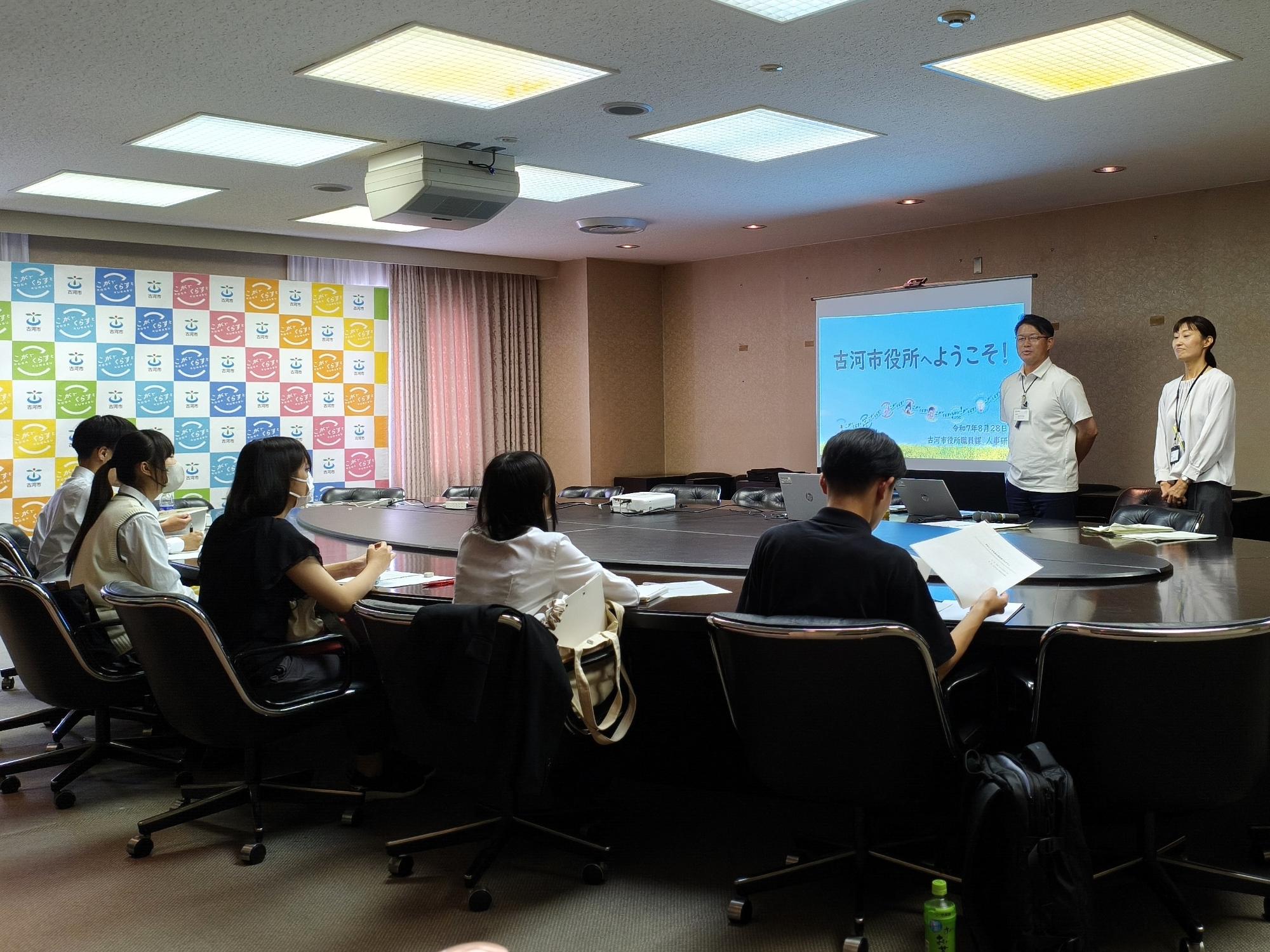 古河市役所への訪問では、まず自治体の役割や市役所の仕事、職員が働きやすい環境を整えるための取り組み、そして市役所職員のワーク・ライフ・バランスについて学びました。