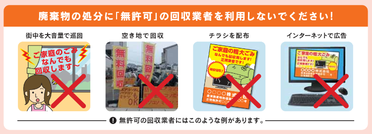 【環境省】「廃家電や粗大ごみなど、廃棄物の処分に『無許可』の回収業者を利用しないでください!」チラシより