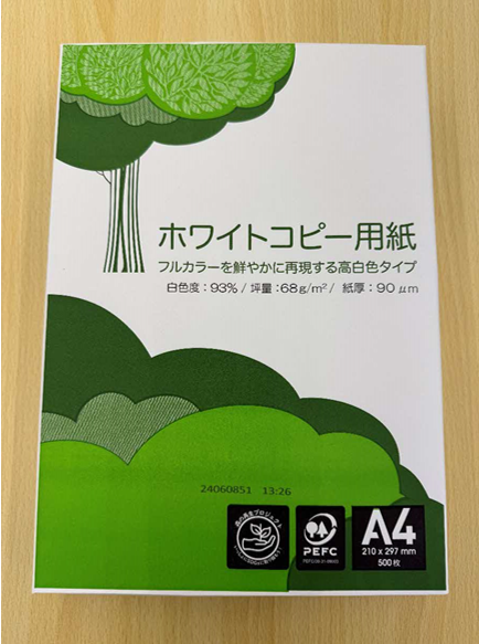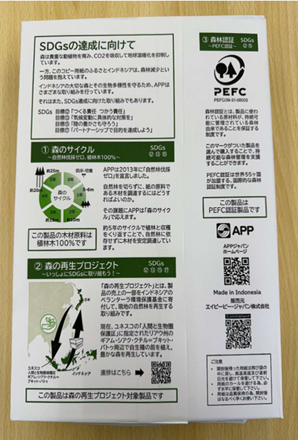 「森の再生プロジェクト」と題して、売り上げの一部をインドネシアのベランターラ環境保護基金に寄付をして現地の自然林を再生する取り組みをしているコピー用紙を使用しています。