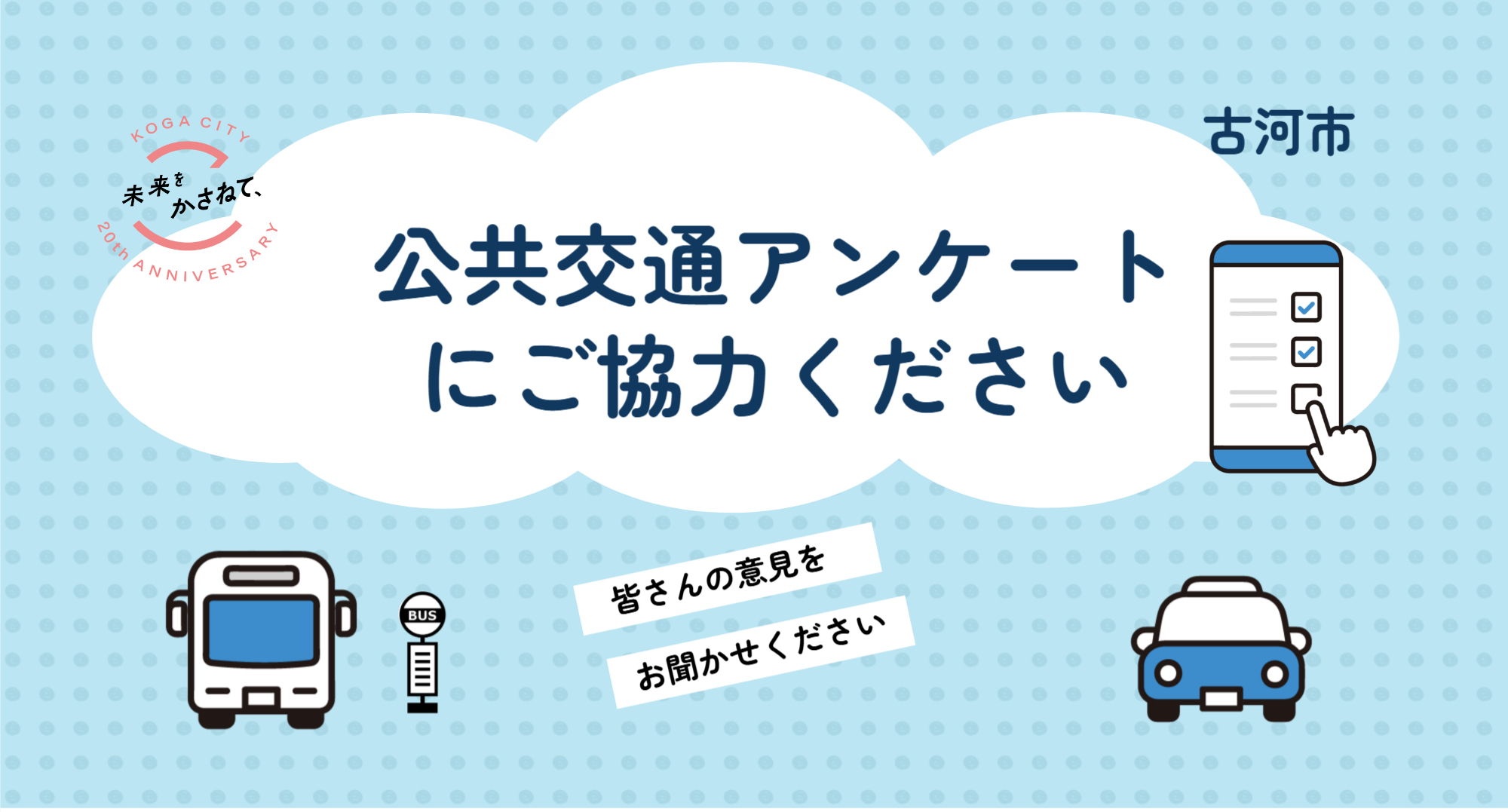 全国的に、車で移動できない方々が増え、公共交通の必要性が高まっています。今後も持続可能な交通体系を構築することを目的に、アンケート調査を実施させていただきます。ご協力くださいますよう、お願い申し上げます。