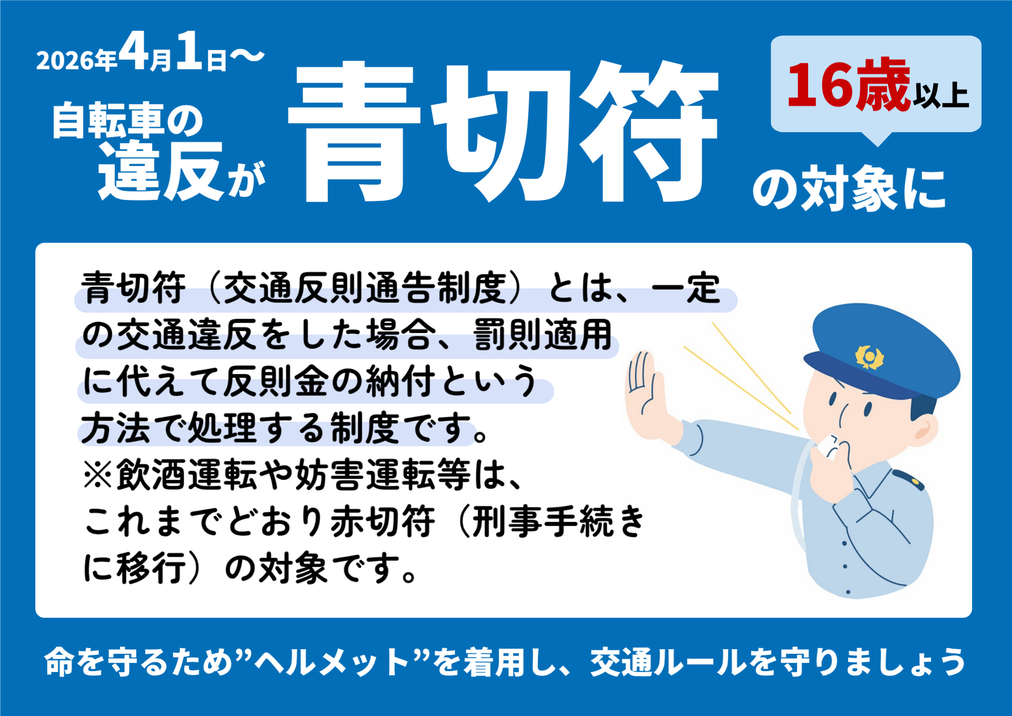 令和8年4月1日から道路交通法の改正に伴い、16歳以上の自転車利用者への「青切符」制度が新たに導入されることとなりました。