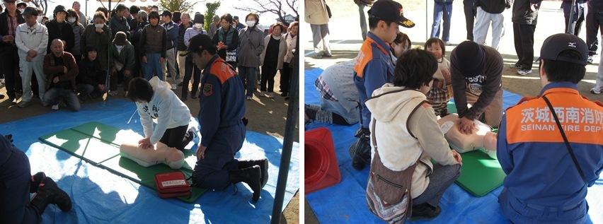 茨城西南消防三和分署のかたの指導で地域の皆さんは真剣に訓練に臨んでいました。何事も体験しなければ、いざという時に使えません。