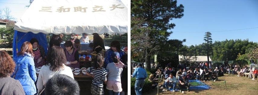 訓練終了後、訓練中に準備していた炊き出し昼食です。手際のよい準備の女性役員の皆さまの底力を感じました。そして校庭で地域のみんなが一団になり美味しくいただきました。