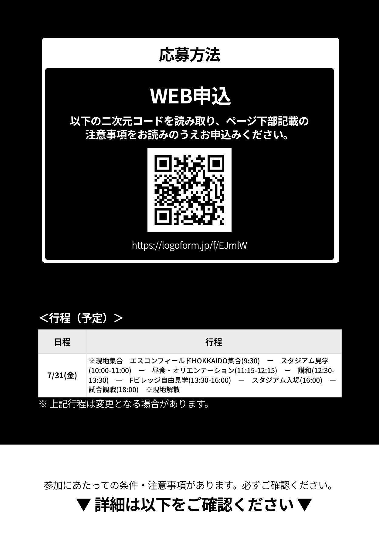 - ただし、現地(エスコンフィールドHOKKAIDO)までの交通費(航空券・電車賃等含む)、宿泊費およびそれらの手配はすべて参加者負担となります。