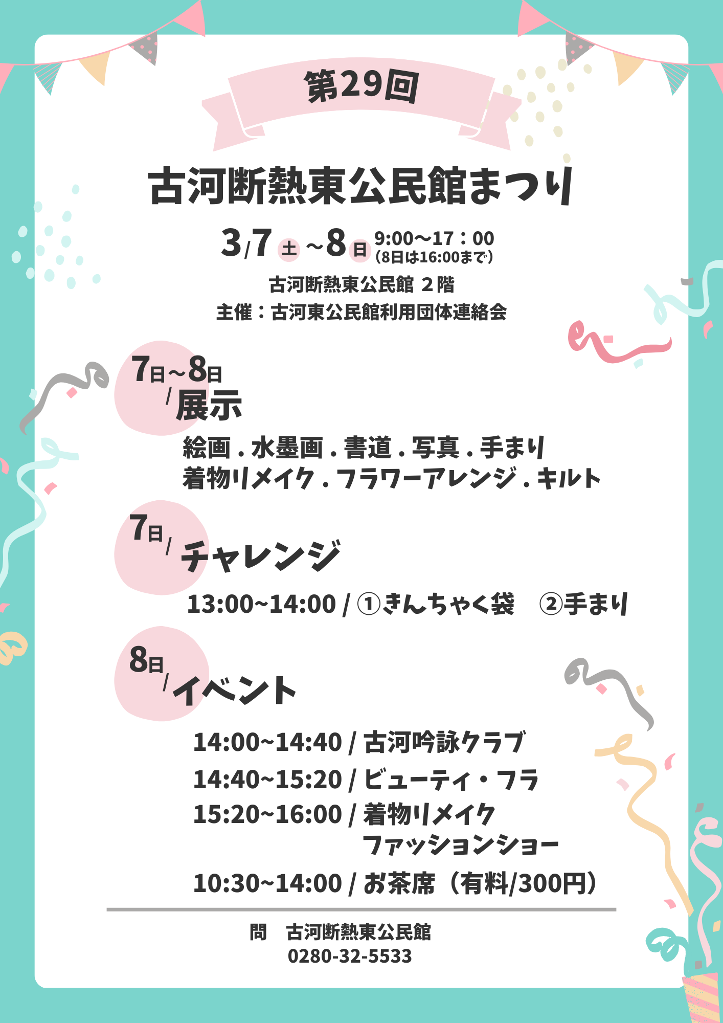 古河断熱東公民館まつりを開催します Tweet 更新日:2026年02月20日 古河断熱東公民館で活動している自主グループの作品展・発表会です。 日時 3月7日(土曜日)〜8日(日曜日) 9:00~17:00(8日は16:00まで) 内容 問 古河断熱東公民館 電話:0280-32-5533