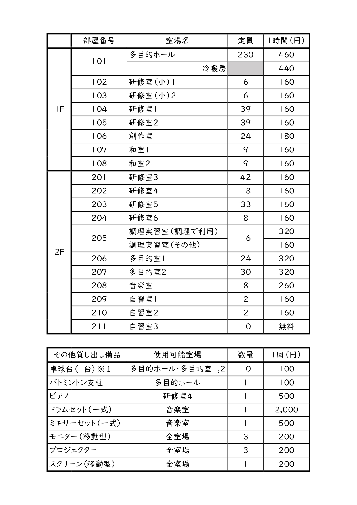 1 利用時間が予約の全時間に満たない場合でも、予約時間分の使用料を徴収いたします。