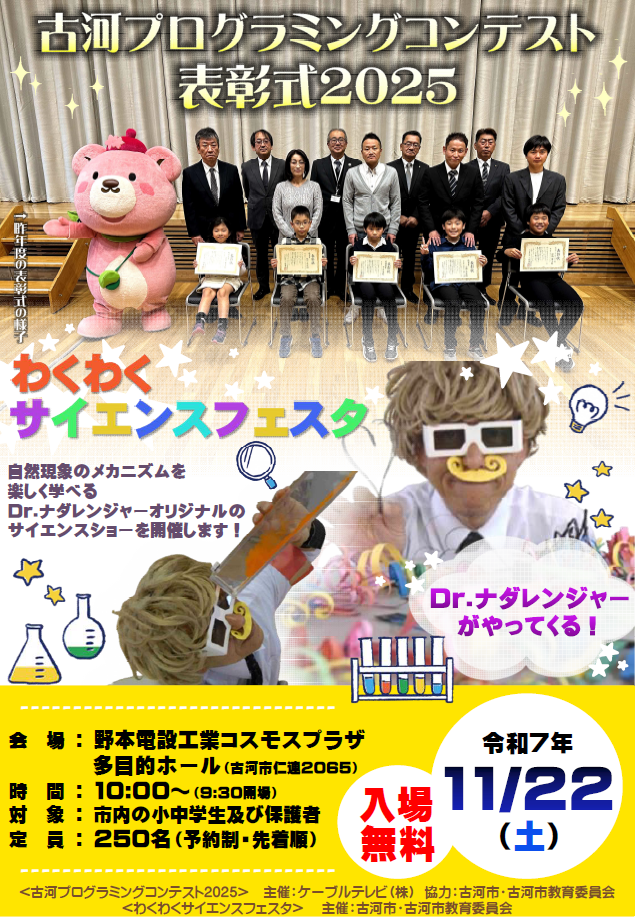 楽しめてタメになる!「Dr.ナダレンジャーの自然災害科学実験教室」「古河プログラミングコンテスト表彰式2025」同時開催!