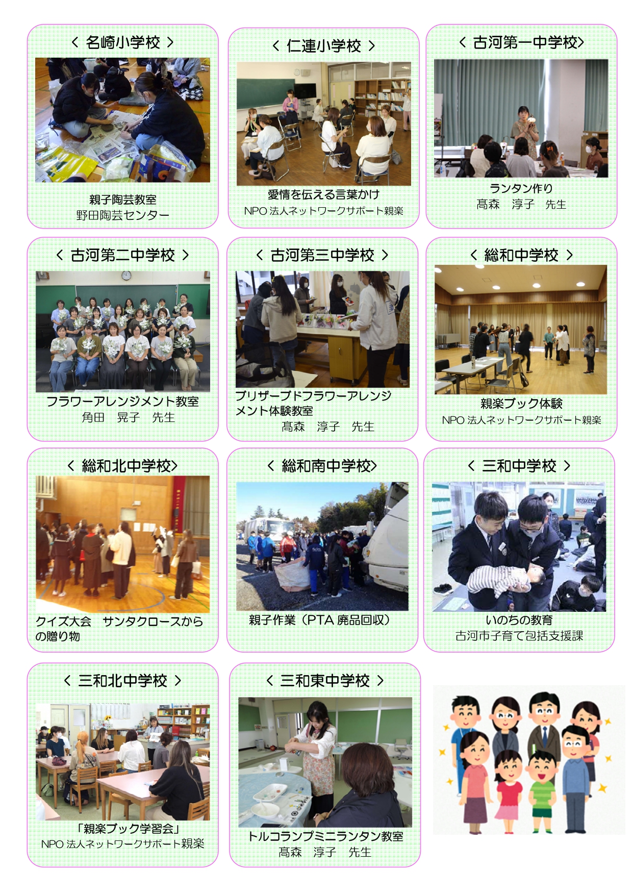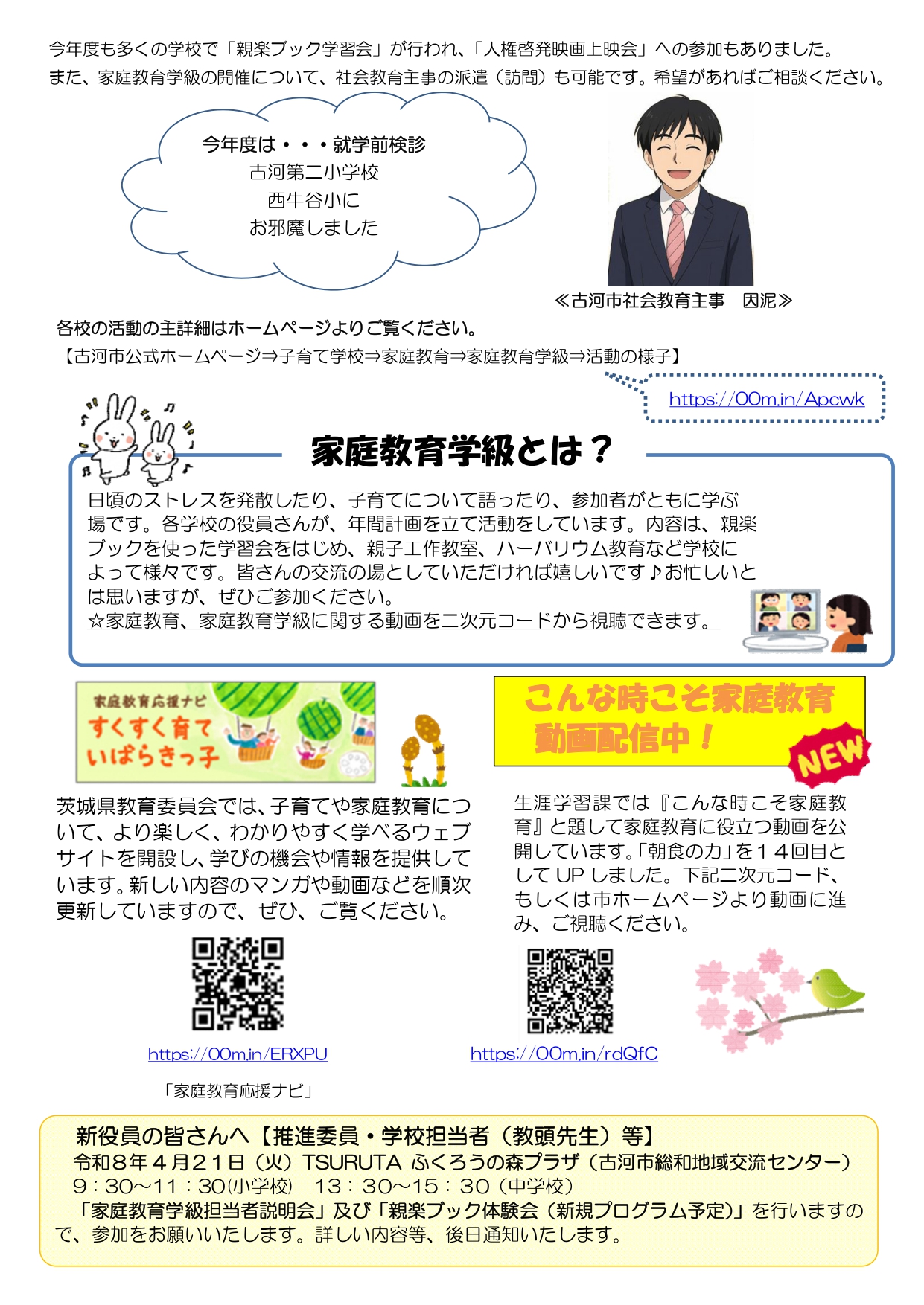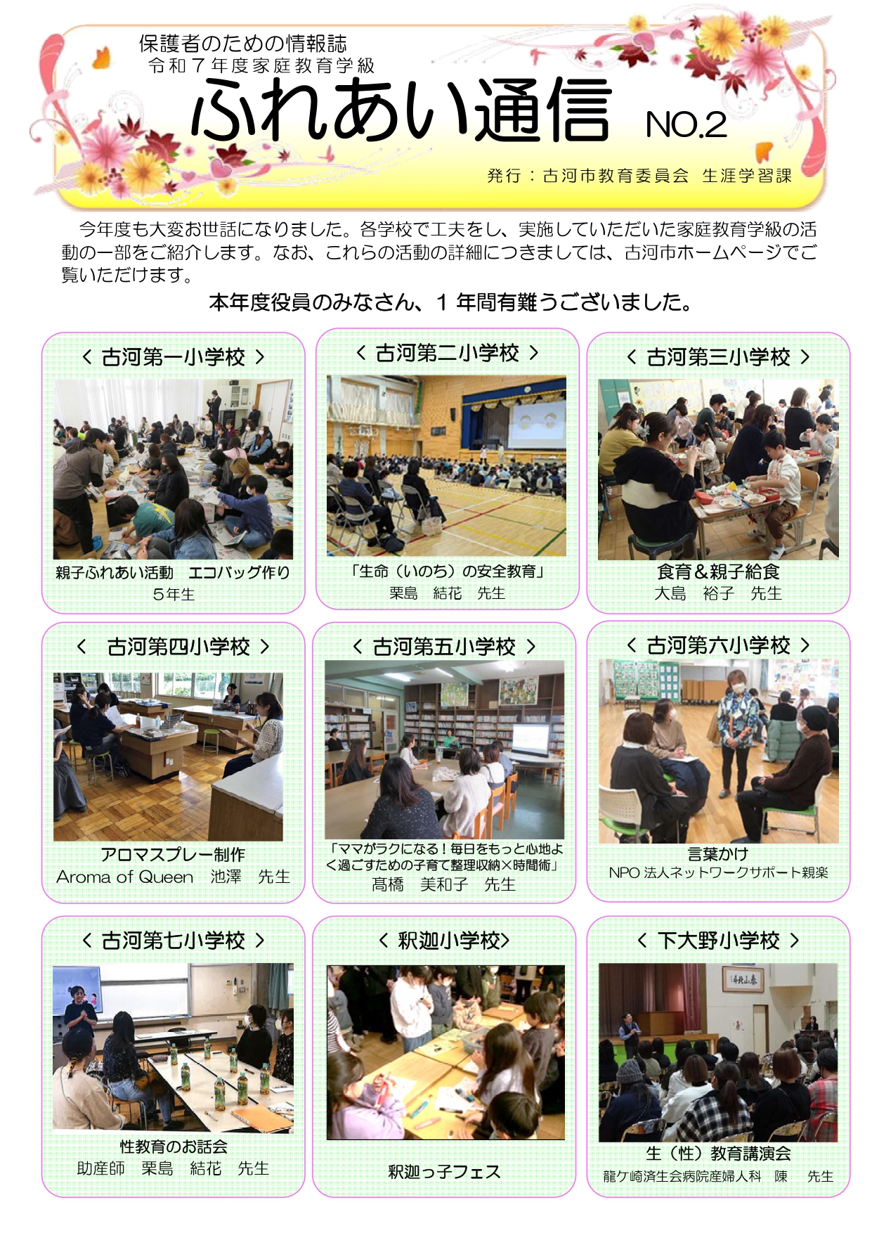 令和7年度 家庭教育ふれあい通信(NO.2) Tweet 更新日:2026年03月26日 今回のふれあい通信は、各学校の家庭教育学級の様子をまとめたものです。 この記事に関するお問い合わせ先 古河市 生涯学習課 所在地:〒306-8601 茨城県古河市長谷町38番18号電話番号:0280-22-5111(代表)ファックス:0280-22-7114生涯学習課へのお問い合わせ