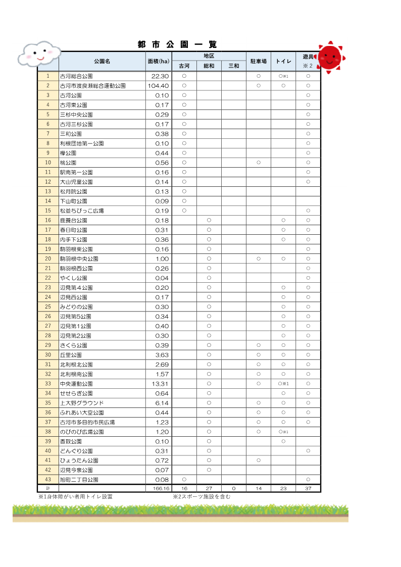 都市公園一覧 Tweet 更新日:2024年06月26日 古河市の公園は、全部で271あります。 都市公園と呼ばれる公園、開発行為によってできた公園、その他の公園等役割は様々です。 以下は、都市公園の一覧です。お出かけの際に参考にしてください。 この記事に関するお問い合わせ先 古河市 都市計画課 所在地:〒306-0198 茨城県古河市仁連2065番地電話番号:0280-76-1511(代表)ファックス:0280-77-1511都市計画課へのお問い合わせ